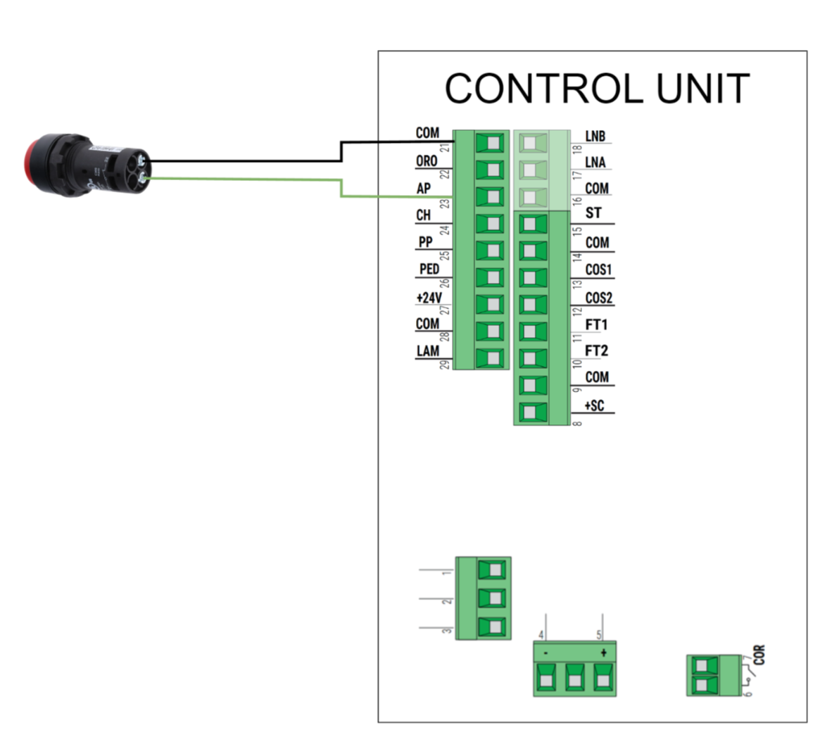 To connect a Parklio™ push button to the Gate X, run two wires from the push button contacts to the AP and COM terminals on the Parklio™ Gate X control board.